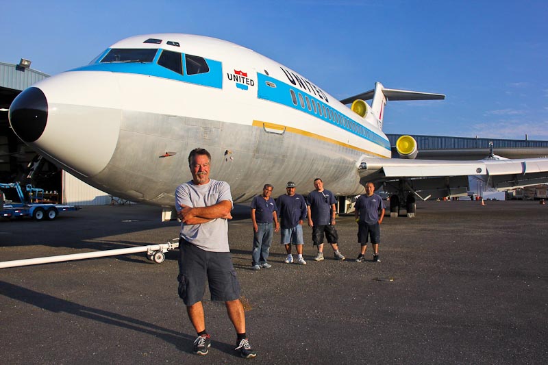 Later, over the years, United cycled through a series on new corporate identities, which resulted in some of these liveries. ![]() ![]() ![]() Finally, prior to donation to the Museum, the airplane was repainted in it's 1964 delivery scheme. ![]() Unfortunately, the Pacific North West is a lousy place to store airplanes (or anything else) outdoors and over a quarter-century, that paint suffered serious deterioration, despite a number of wash and polish jobs. ![]() ![]() As part of the refurb and relocation project, it was decided to repaint the airplane. The services of Guy Amico and his crew from Global Jet Painting in California were enlisted. Guy and his folks had done an outstanding job last summer repainting the 747 Prototype. We are very pleased that United Air Lines has volunteered to pay for the repainting job. PPG Aerospace donated the paint. The airplane was washed and cleaned up as best as possible. Then it was sanded down, spot primed, masked and painted. ![]() ![]() ![]() ![]() ![]() Next, the airplane was masked. ![]() ![]() ![]() ![]() Bob Bogash, T.C. Howard, unidentified, Guy Amico Finally, it came time to paint the airplane. A lot of people don't realize you can paint an airplane outside. Well, as in this case, you have no choice. So, we waited until summer. Warm and (mostly) dry. Another thing people are shocked about is - airplanes outside don't always get spray-painted. They get painted with paint rollers. Yes - good old paint rollers. Works fine! ![]() ![]() ![]() ![]() ![]() ![]() ![]() ![]() Guy Amico and painting crew. Tom Cathcart photo. ![]() ![]() Return to 727 Page Return to Home Page |