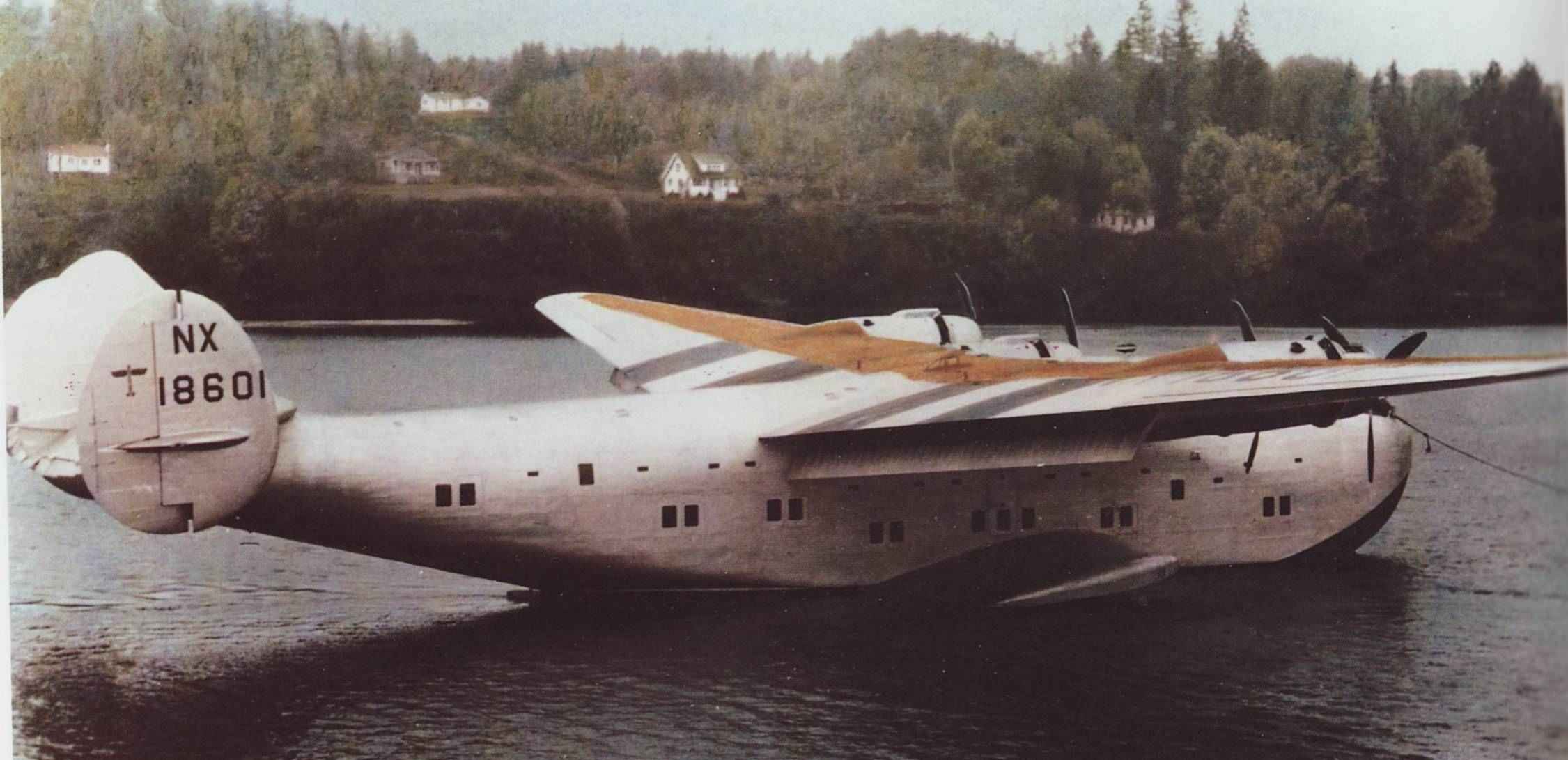 Other serious problems involved the size, shape, and location of the sponsons, or sea-wings. And, the airplane had a very bad porpoising problem on the water. Eventually, however, the location and geometry of the hull step was adjusted to resolve that problem. Here, flying on only the starboard engines.
