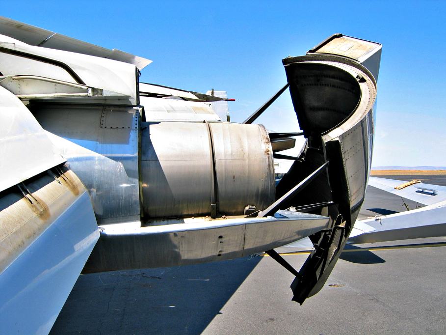 'jes fix 'em. The 727 thrust reversers had six parts: two clamshell doors inside the tailpipe that closed and blocked the exhaust gases; two sets of cascade vanes that redirected the exhaust gas flow; and two sets of deflector doors that aimed the redirected exhaust gases forward. The deflector doors were the problem. They were semi-hemispherical doors that were attached with a four bar linkage.