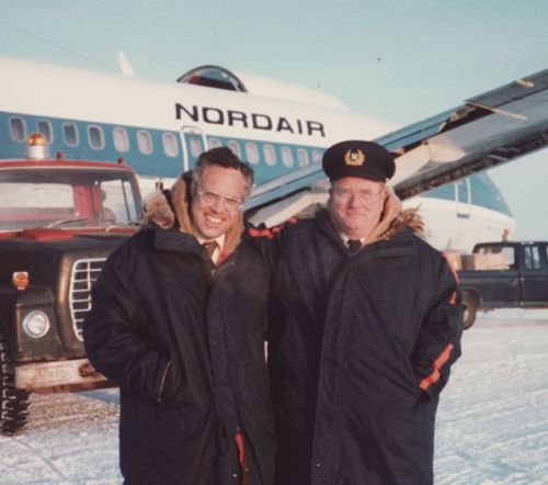I spoke with him quite often. He'd always start crying when I called, which made me feel bad...and, in some ways, good - that he felt that way. He always talked of this picture he had on the wall that he cherished - of him and me somewhere up North - I cherished the fact that he cherished it. Later, after he died, I did a bit of rummaging, and came up with the picture - the family had taken it down from his wall and cropped it for his obit. It was taken at Nanisivik on northern Baffin IslandĀ 21 Oct 1982 - ambient temp -20 F.